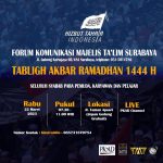 Forum Komunikasi Majelis Ta’lim Surabaya berencana akan melakukan kegiatan *”TABLIGH AKBAR MENYAMBUT RAMADHAN 1444 H”*, kegiatan tersebut akan dilaksanakan pada hari rabu tanggal 22 Maret 2023, pukul 07.30 s/d 11.00 Wib di Taman Apsari (Depan Gedung Grahadi) dengan jama’ah berjumlah 500 orang.